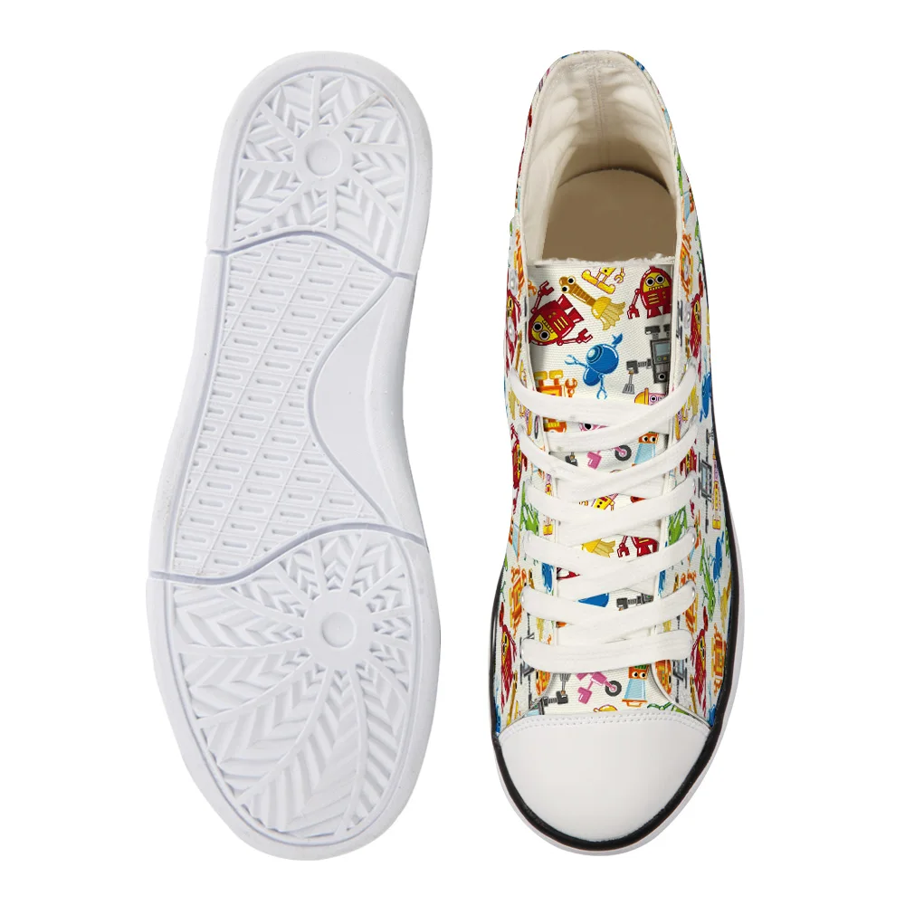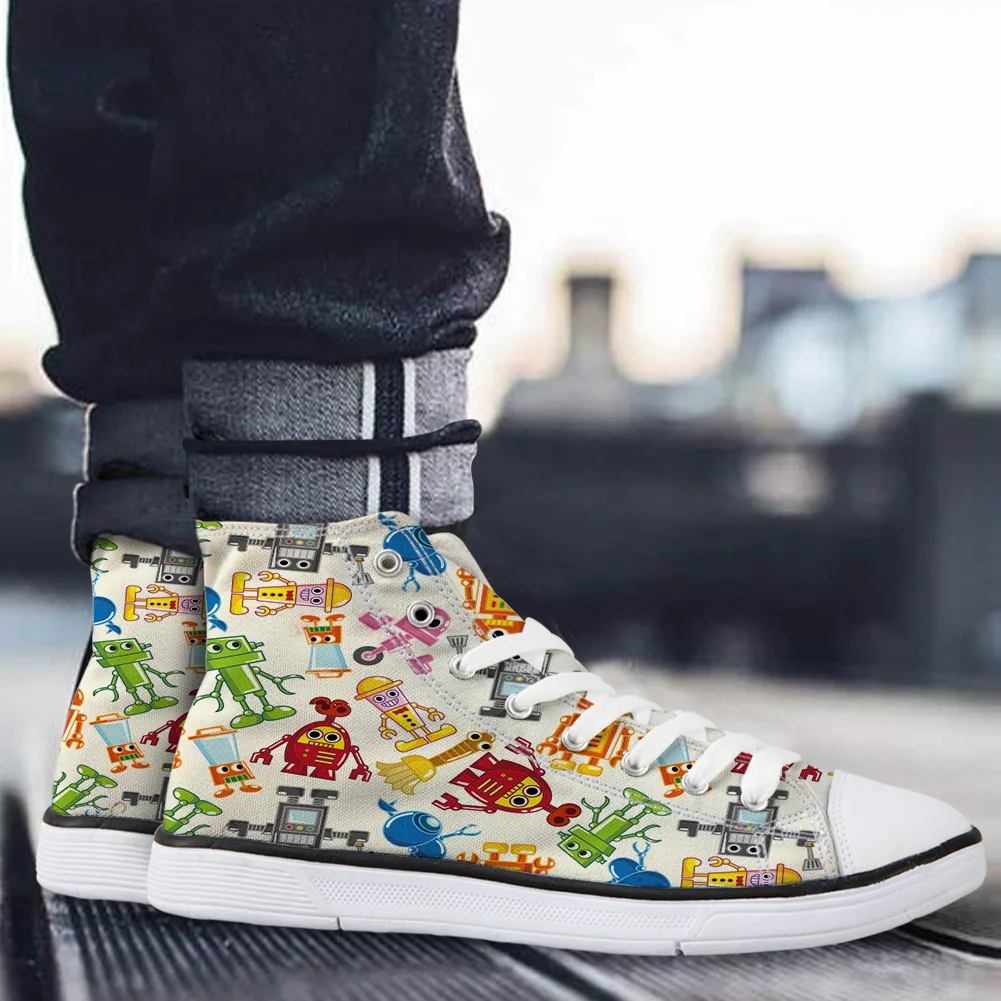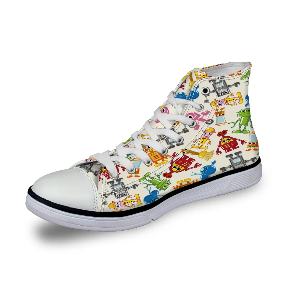 Related Product for WHEREISART Women Canvas Shoes Colorful Cartoon Robot Kids High Top Flats Unisex Vulcanized Shoes Fe