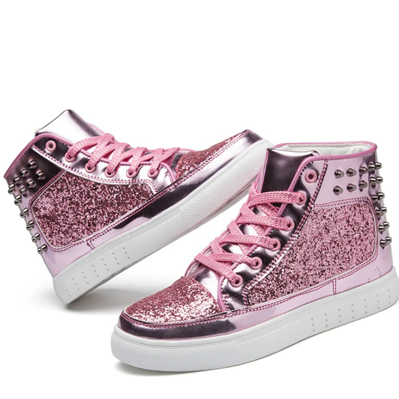 Related Product for 2019 Women High Top Sneakers Sequins Rivet Glitter High-Cut Round Toe Lace-Up Shoes Outdoor Skatebo